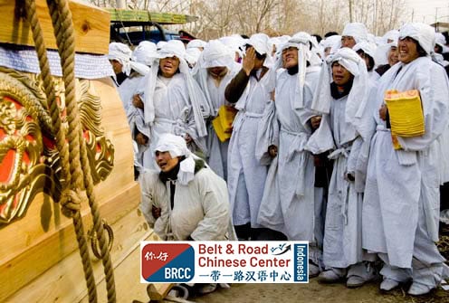 Saat upacara kematian, keluarga yang berduka mengenakan pakaian putih dari kain kasar (kadang tidak dijahit rapi) sebagai bentuk penghormatan dan kesederhanaan di hadapan kematian.