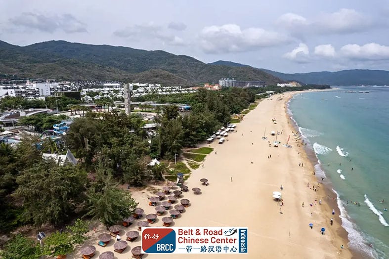 Kawasan ini memiliki garis pantai sepanjang 7,5 kilometer yang membentang anggun di pesisir selatan Pulau Hainan. Hamparan pasir putihnya lembut sehingga kaki seolah tenggelam perlahan setiap kali melangkah, memberikan sensasi relaksasi yang jarang ditemukan di destinasi lain. Pasirnya yang bersih serta terawat menciptakan kontras yang indah bersamaan air laut yang jernih, terpantulkan sinar matahari layaknya permata yang berkilauan.
